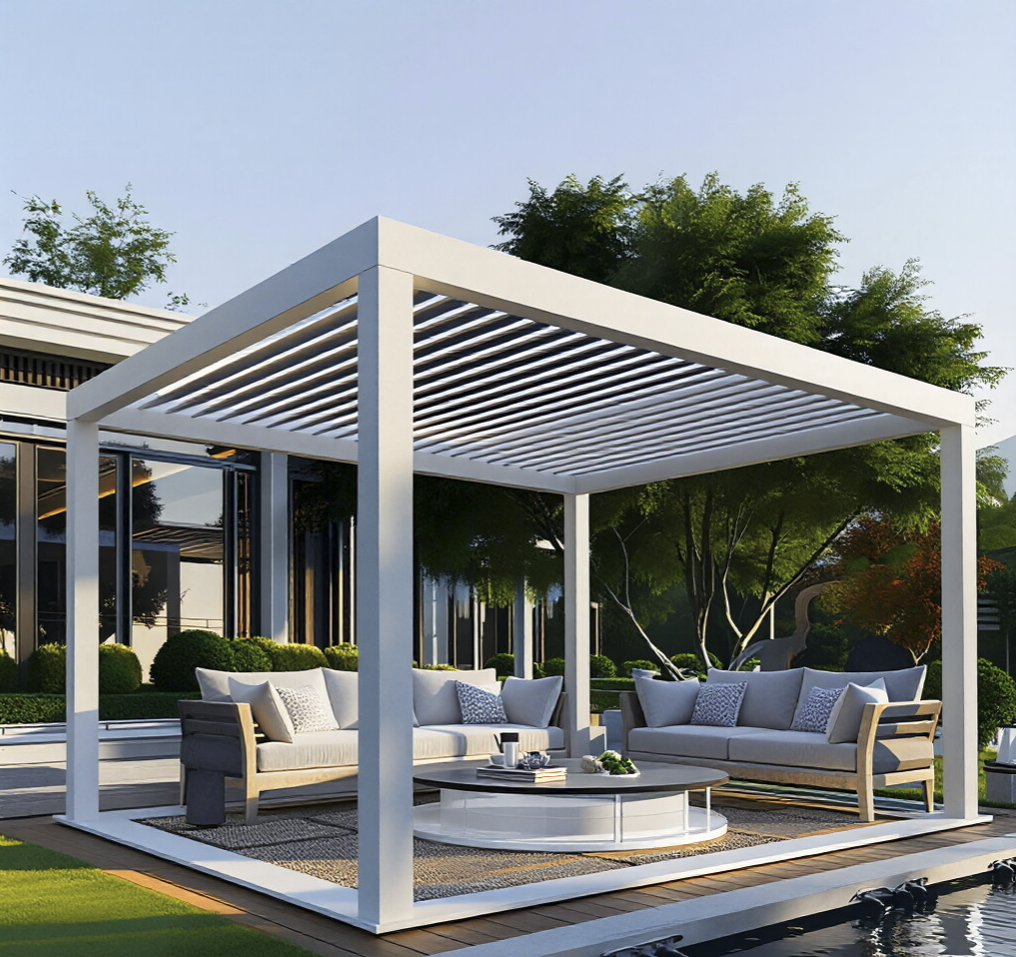 An advanced modular outdoor living solution featuring adjustable roof slats for precision climate control and all-weather protection.