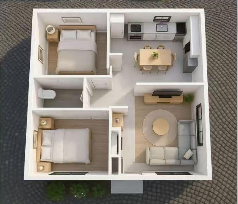 This single-story light steel villa features a functional 2-bedroom layout designed for maximum spatial efficiency. Utilizing a high-strength galvanized steel frame, the structure offers superior seismic performance and thermal insulation compared to traditional masonry construction.