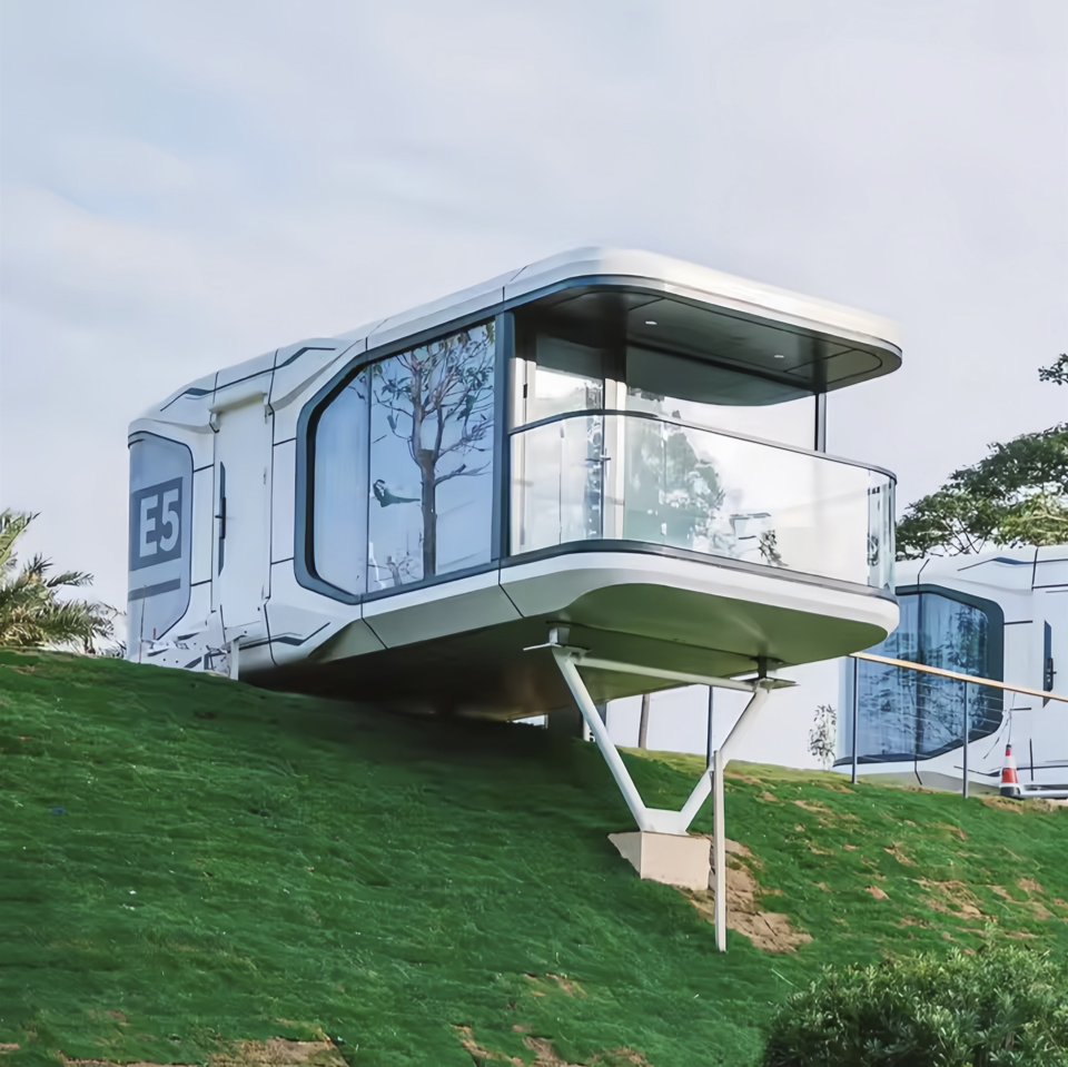 The Cantilever Modular Pod House (E5 Series) represents the pinnacle of prefabricated architecture, combining a high-strength galvanized steel frame with an aerospace-grade aluminum alloy shell. Designed for rapid deployment, this self-contained unit features a distinctive cantilevered balcony and floor-to-ceiling panoramic glazing to maximize views and minimize site impact.