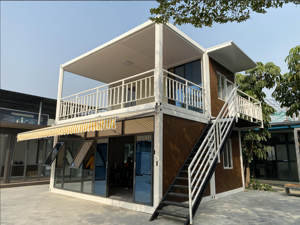 Unlike standard containers, this model features a reinforced rooftop terrace and external staircase, doubling the usable footprint for leisure or commercial use.