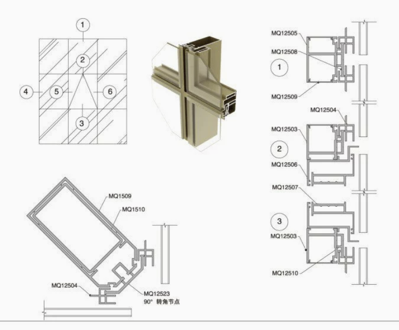 Our profiles are manufactured to meet international standards including ASTM and GB/T. We offer a wide range of mullion and transom configurations, including 90-degree corner joints (MQ12523) and specialized thermal break inserts for enhanced energy efficiency.