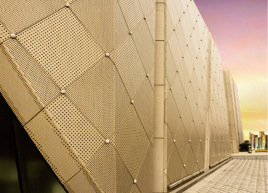Precision CNC-perforated metal facade systems combining sophisticated aesthetics with functional ventilation and acoustic control.