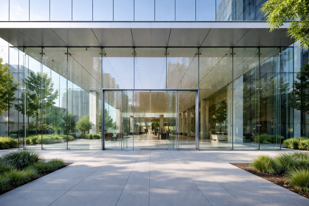 Maximizes visual openness and modern facade aesthetics.
