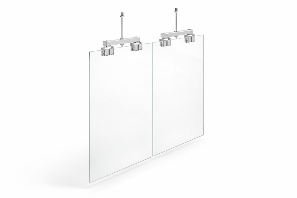 The system is configured with top-mounted clamps or hanging brackets, allowing glass panels to be suspended without bottom support. Structural variations include standard hanging systems and reinforced configurations with glass fins.