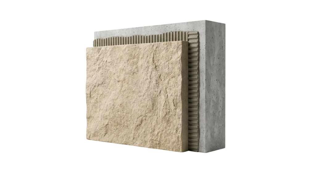 Panels or bricks are installed using high-performance adhesives, suitable for low-rise buildings and renovation applications.