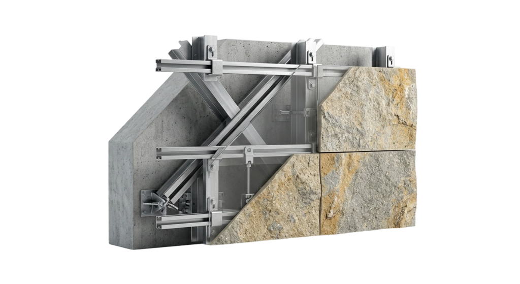 Combines artificial stone panels with metal support systems to improve structural stability and allow use in larger façade applications.