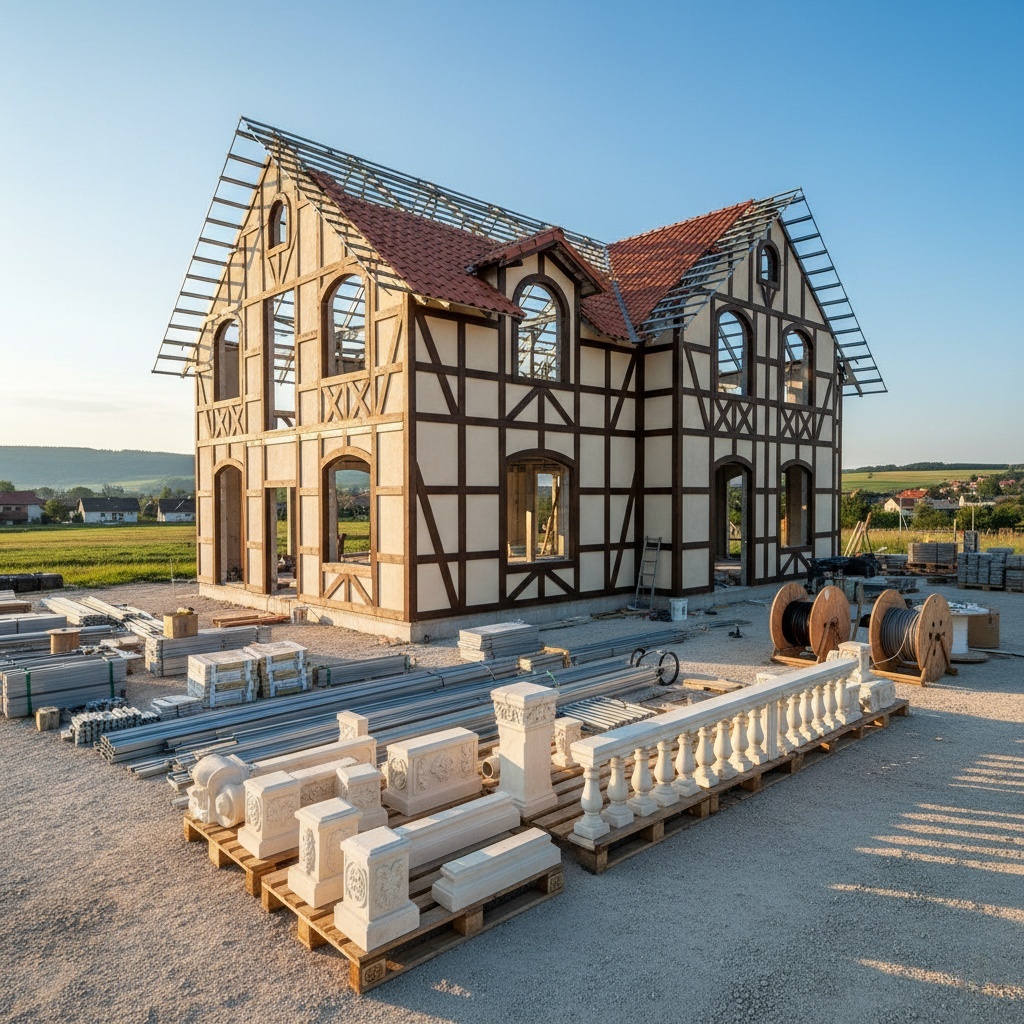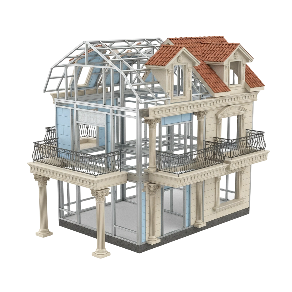 This solution allows full customization of façade elements such as columns, moldings, balconies, and roof structures to match different European architectural styles and project requirements.
