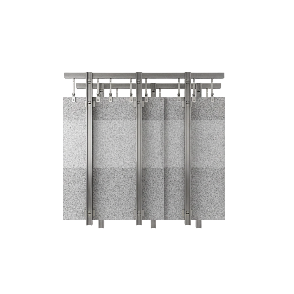 Stone panels are installed through side grooves and supported by metal components. It provides a cost-effective solution with reliable structural support for standard commercial applications.