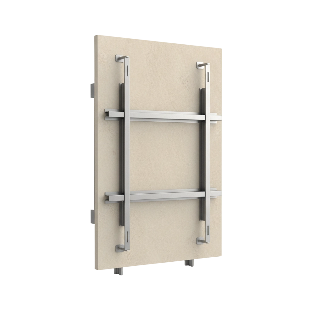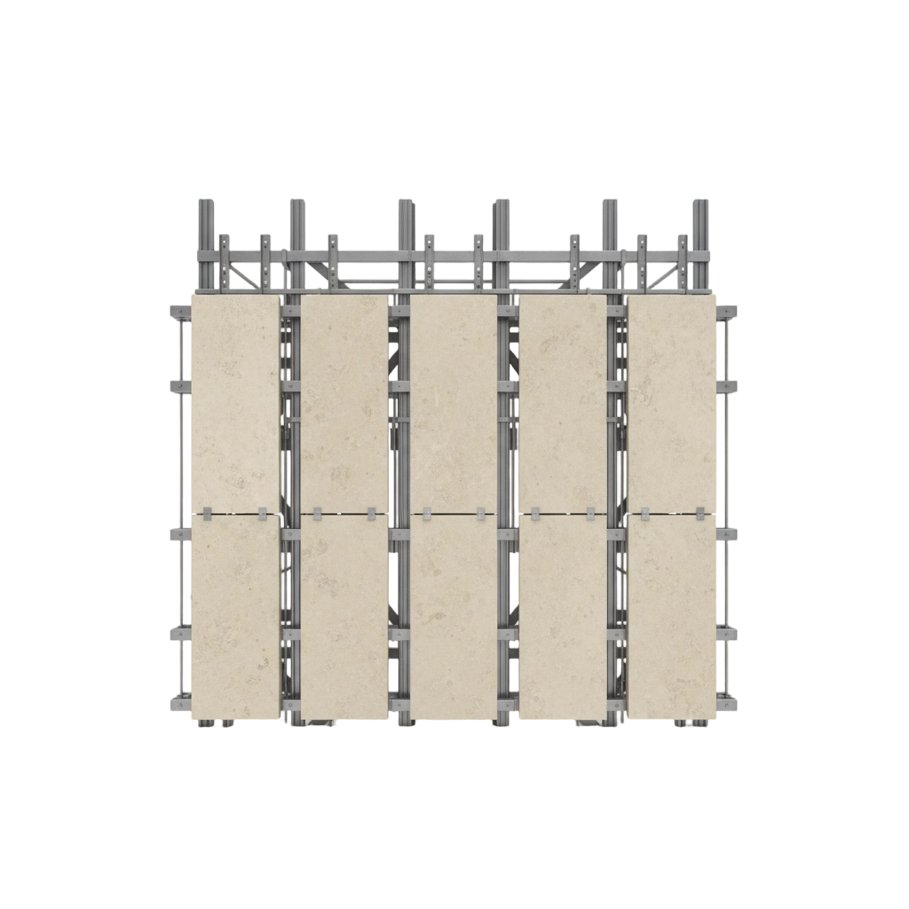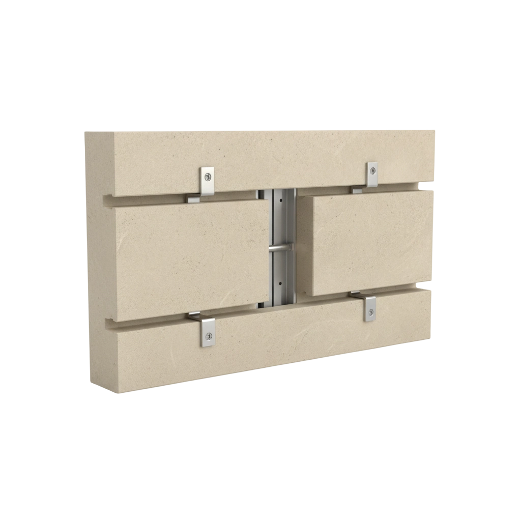 Limestone panels are supported through side grooves, offering a practical and cost-effective solution for standard façade applications.