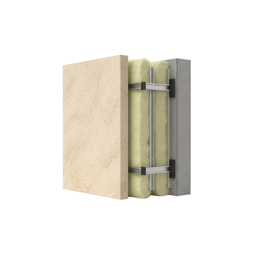 Combines limestone panels with thermal insulation layers to enhance energy efficiency while maintaining a natural stone façade appearance.
