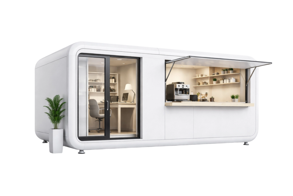 Units can be configured for different purposes such as offices, retail kiosks, reception spaces, or exhibition units based on project requirements.