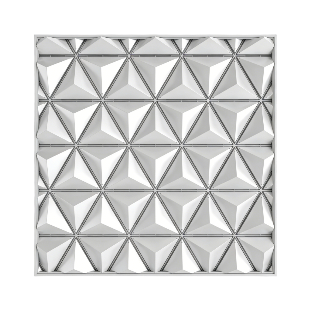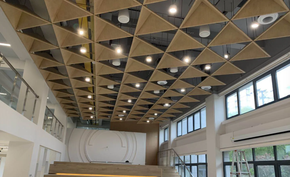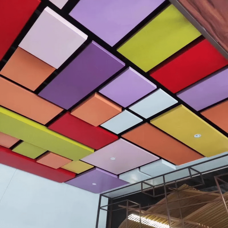 Uses modular panels arranged in customized geometric layouts to achieve visually striking and structured ceiling designs.