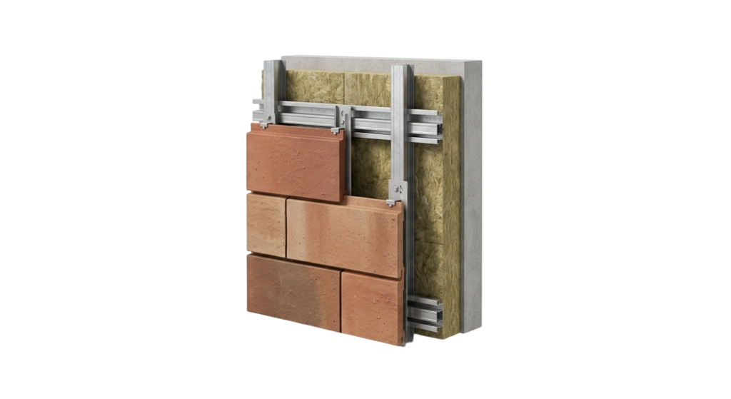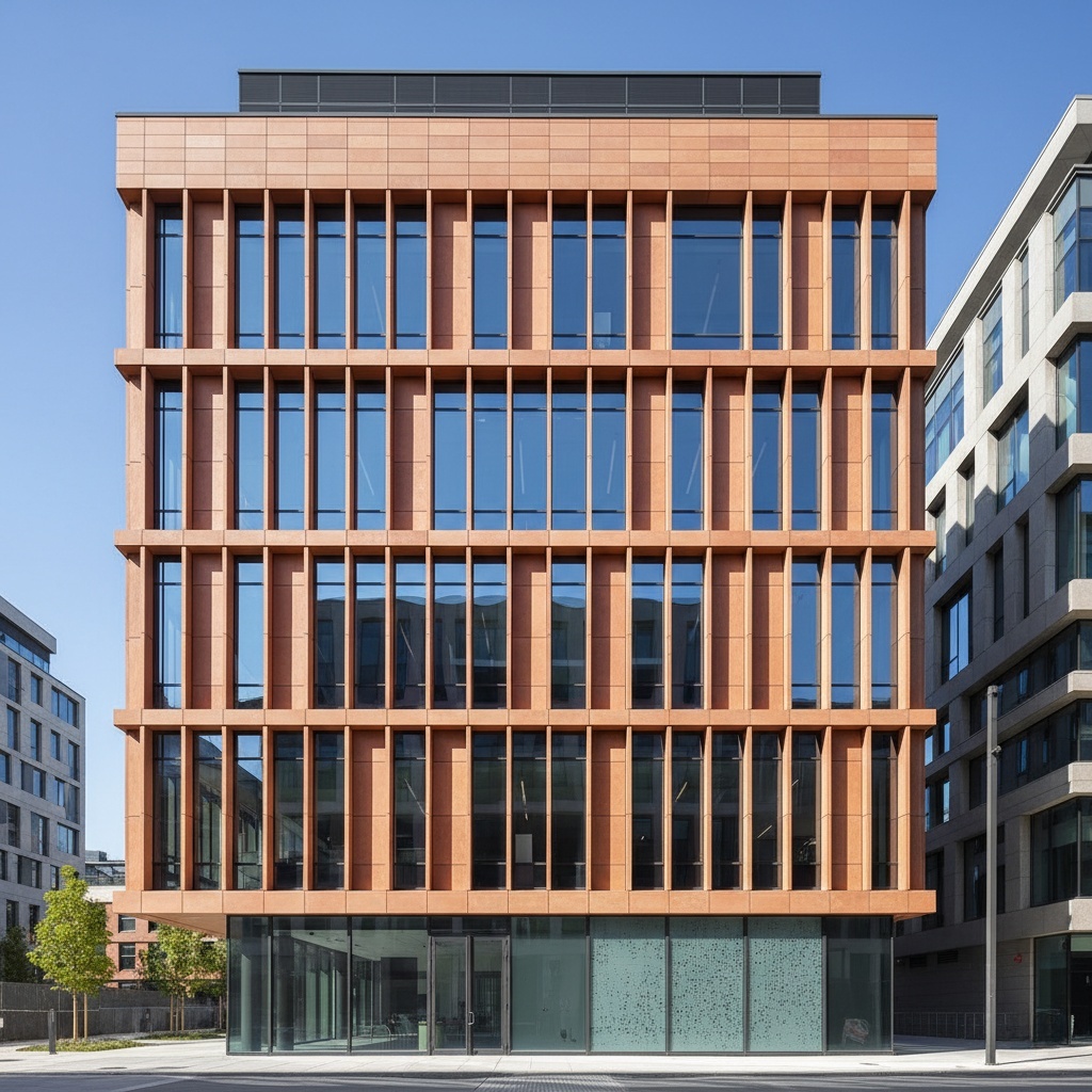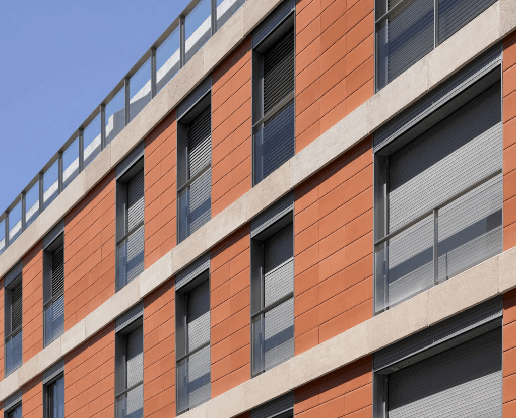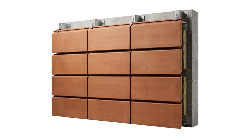 Combines terracotta panels with insulation materials to improve thermal performance while maintaining a ventilated façade structure.